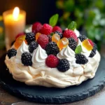 A festive dessert featuring light, airy meringue topped with whipped cream and vibrant fresh fruits, perfect for holiday gatherings.
