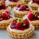 - Garnish and serve: Before serving, top each tartlet with chopped pistachios and fresh raspberries for an extra pop of color and flavor.